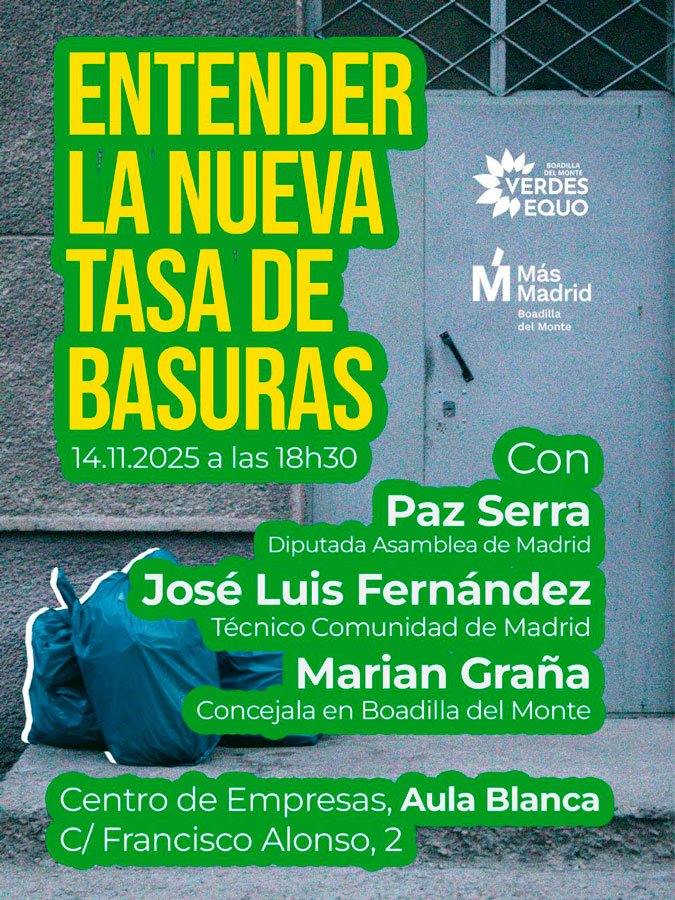 El próximo 14 de noviembre, a las 18.30, se celebrará en el Centro de Empresas de Boadilla un encuentro informativo para explicar la nueva tasa de basuras, organizado por Más Madrid y Verdes Equo.