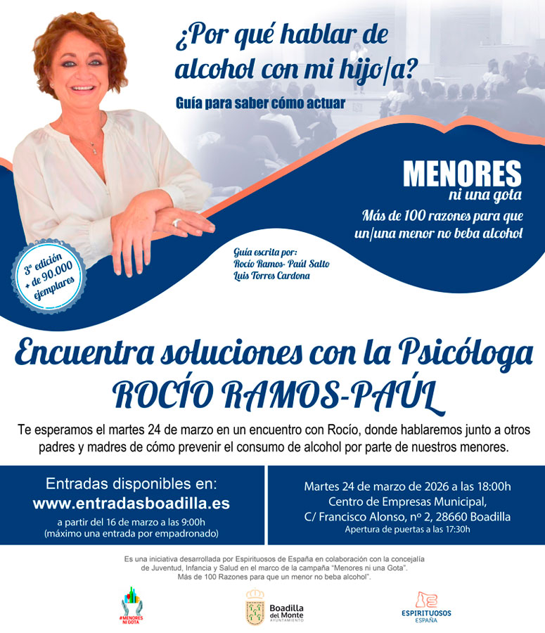 Esta es la quinta ocasión en la que Rocío Ramos-Paúl (Supernanny) viene a Boadilla del Monte a hablar sobre el alcohol en adolescentes. En la charla, la conocida psicóloga aportará pautas sobre cómo enfrentarse a un posible consumo de alcohol entre los hijos menores de edad.