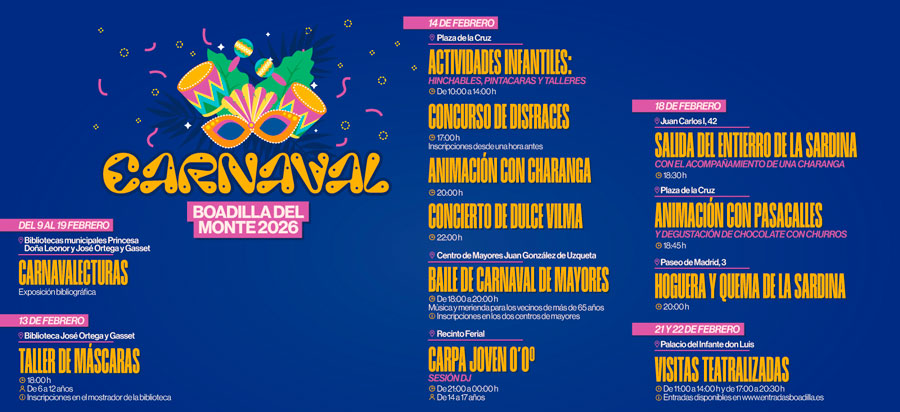 Desde el fin de semana y hasta el 18 de febrero, Boadilla del Monte celebrará las fiestas de carnaval 2026. Esta es la programación: